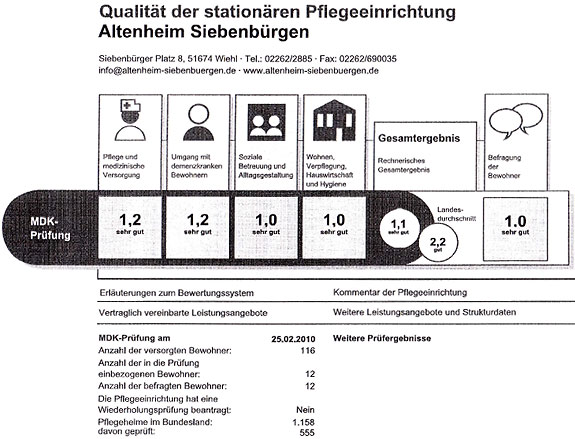 Die vom MDK durchgeführte Überprüfung aller Bereiche des Alten- und Pflegeheims hat zu dem erfreulichen Ergebnis geführt, dass die Einrichtung mit 1,1 benotet wurde. Damit liegt die Qualitätseinstufung des Hauses Siebenbürgen weit über dem in NRW festgestellten Durchschnitt von 2,2.
