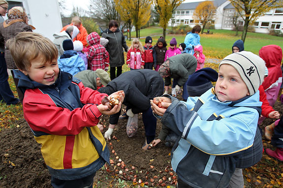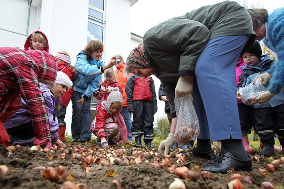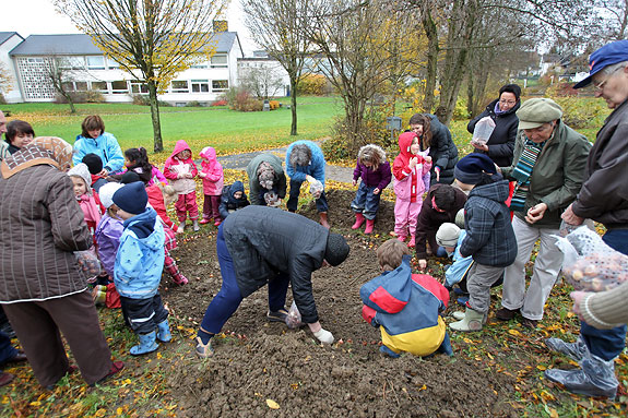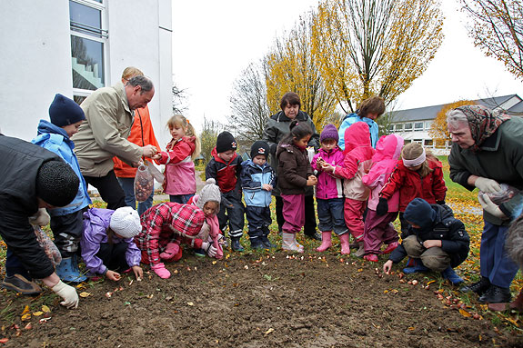 (22.11.2010) Am 11. November fand die zweite Pflanzaktion am Turm der Erinnerung statt. Die Bewohnerinnen und Bewohner des Hauses Siebenbürgen setzten mit eifriger und unermüdlicher Unterstützung der Kinder des Adele-Zay-Kindergartens und des evangelischen Kindergartens 1.000 Tulpenknospen in das dafür vorgesehene Beet ein.