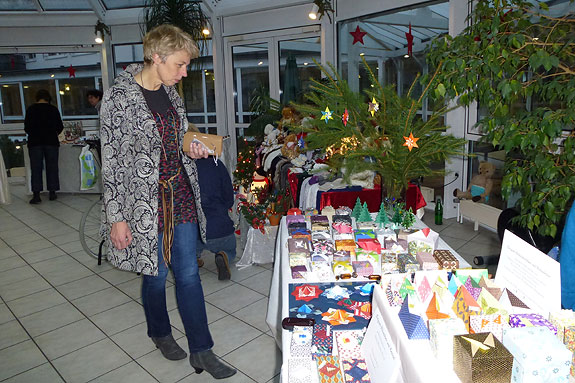 Die von Bewohnern und Ehrenamtlichen gestrickten und gebastelten Angebote begeisterten viele Besucher. Warme Socken und Schals, Hausschuhe, kunstvolle Fensterbilder und glitzernder Schmuck aus Murano-Glas, Teddybären aus Papier, gefaltete Geschenkartikel, gedrechselte Holzartikel und originelle Geschenkpäckchen konnten zu günstigen Preisen erworben werden. Die Vielfalt der Möglichkeiten erschwerte so manche Entscheidung. Nach interessierter Besichtigung und erfolgreichem Weihnachtseinkauf saßen viele der Bewohnerinnen und Bewohner noch lange bei Kaffee und Kuchen beisammen und beobachteten das bunte Treiben.