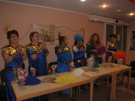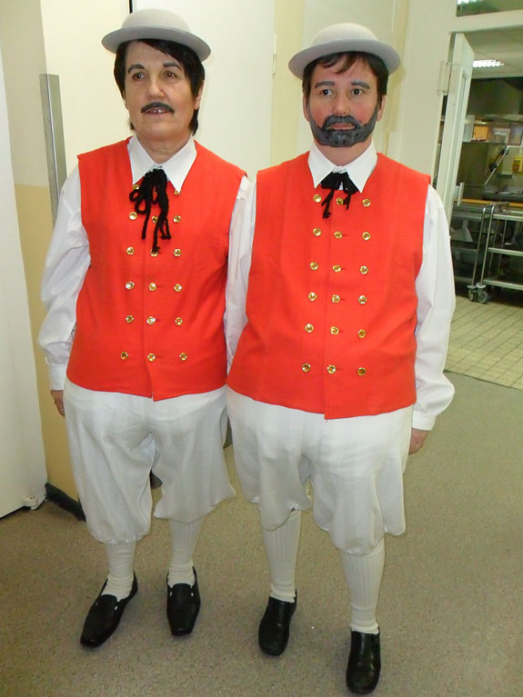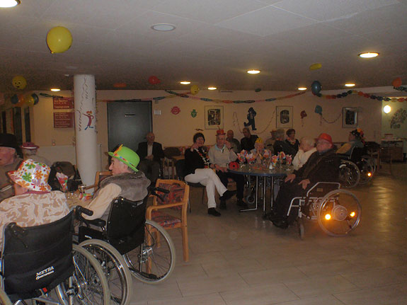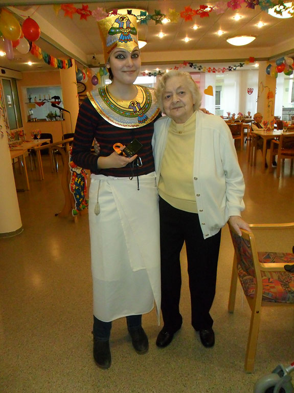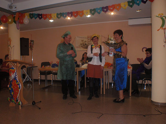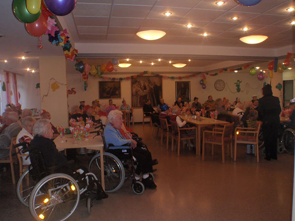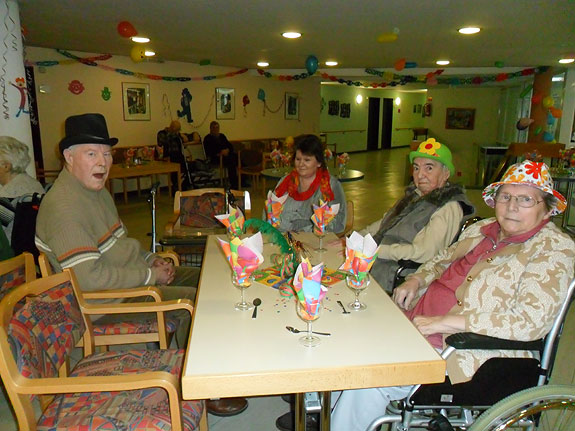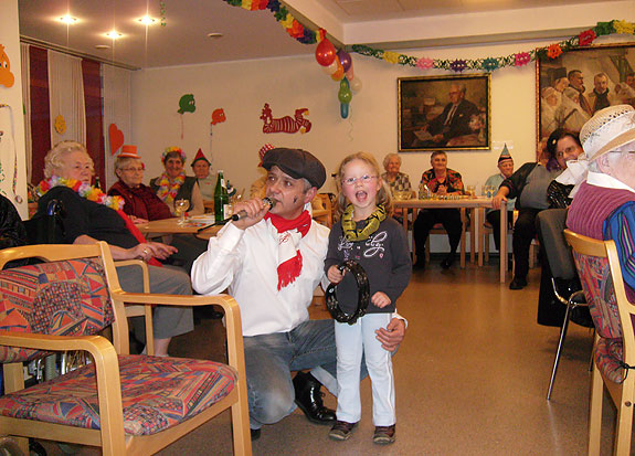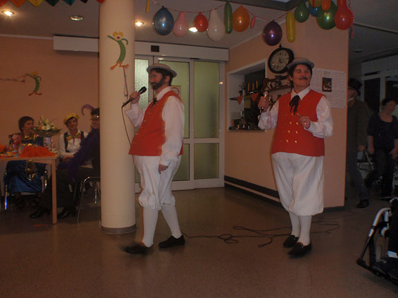 Während knuspriges ofenwarmes Salzgebäck der hauseigenen Küche und lecker Punsch Magen und Herz erwärmte, ehrte der Leiter des Hauses Friedrich Barth zwei Mitarbeiterinnen für ihre 10-jährige treue und gewissenhafte Arbeit. Kräftiger Applaus der Anwesenden unterstrich seine Worte. Dazu erhielt jede einen großen Blumenstrauß. Anschließend wurden die neu Zugezogenen namentlich begrüßt, und den Geburtstagskindern in der großen Runde gratuliert. Viel Heiterkeit lösten Ovidia Weber und Maria Müller aus, als sie in der Gestalt der "Wildecker Herzbuben" auftraten und mit bekannten Melodien alle zum Schunkeln und Singen brachten. Den Abschluss der Karnevalsveranstaltung krönten Markus Schneider und sein Freund Thomas mit kölschem Flair. "Echte Freunde", "Rut sin de Ruse" und manch andere bekannte Lieder ließen die Herzen aufgehen und selbst die jüngste Teilnehmerin war noch lange von Begeisterung erfüllt. Unserer Therapeutin Elke Schmidt verdanken wir auch in diesem Jahr eine fröhliche Karnevalsveranstaltung im Haus Siebenbürgen.