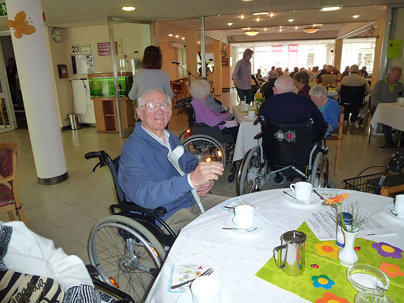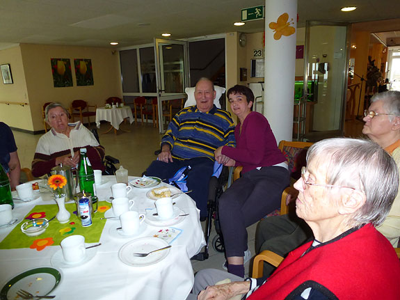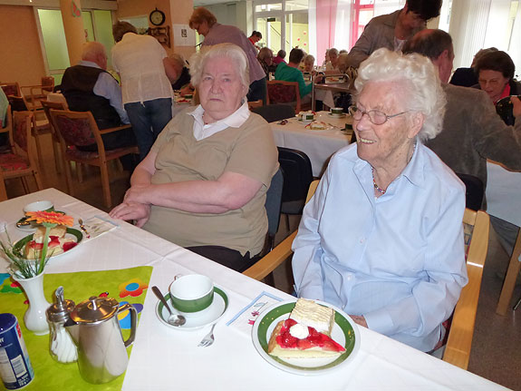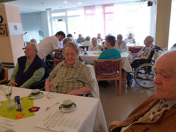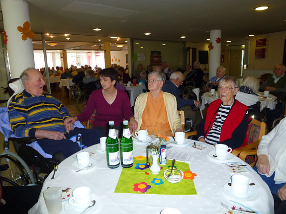 Um 15:00 Uhr starteten wir mit der Begrüßung der zahlreich erschienenen Bewohnerinnen, Bewohner und vielen Gästen.Herr Fanchy, Vorsitzender des Adele-Zay-Vereins gratulierte den Geburtstagskindern der letzten drei Monate nachträglich zum Geburtstag. Eine Mitarbeiterin wurde im Anschluss zu ihrem 10-jährigen Jubiläum von Herrn Barth mit einem schönen Blumenstrauß für ihren treuen und gewissenhaften Einsatz im Haus Siebenbürgen geehrt. Danach wurde wie immer selbst gebackener Kuchen und Kaffee gereicht.