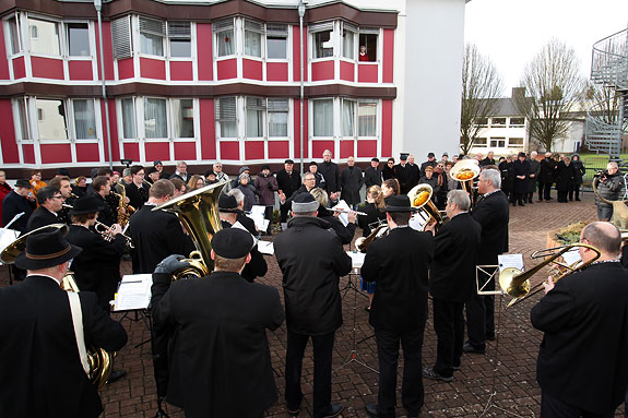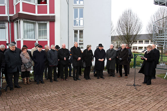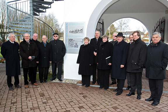 Enthüllung einer Gedenktafel im Robert-Gassner-Hof in Drabenderhöhe zur Erinnerung an die Flucht und Evakuierung der Siebenbürger Sachsen im September 1944 und die Deportation in die Sowjetunion im Januar 1945, von links: Dr. Hans Georg Franchy, Wilfried Bast, Rainer Lehni, Harald Janesch, Kurt Franchy, Enni Janesch, Bischof Reinhart Guib, Oberkirchenrätin Barbara Rudolph, Volker Dürr, Superintendent Jürgen Knabe, Pfarrer Frank Müllenmeister, Pfarrer Rüdiger Kapff und Landrat Hagen Jobi. Fotos: Christian Mlezer