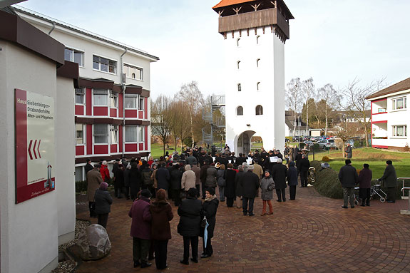Im Anschluss an den Gottesdienst wurde am Turm der Erinnerung im Robert-Gassner-Hof eine Gedenktafel angebracht, die an Flucht und Vertreibung der Siebenbürger Sachsen im September 1944 sowie an die Deportation in die Sowjetunion im Januar 1945 erinnern soll: „Gegen das Vergessen“ und „Zum Gedenken an den Verlust der Heimat und der Opfer von Hunger, Kälte und Gewalt“. Neben dem Text sind Zeichnungen zu sehen von Adolf Kroner (Die Flucht) und von Friedrich von Bömches (Das Lager).