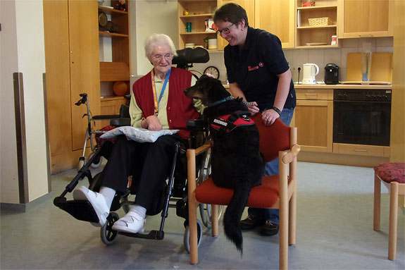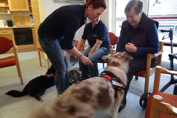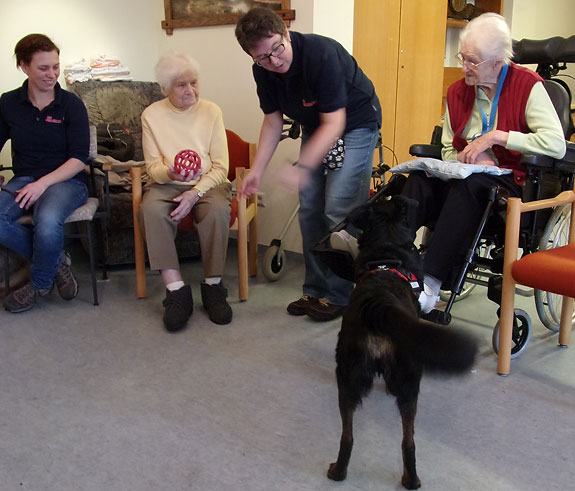 Gemeinsam mit vier Bewohnern in der Runde hatten alle große Freude. Mit den Hunden Kontakt aufzunehmen und Säckchen werfen, die die Hunde wieder bringen mußten, hat allen richtig Spaß gemacht. Auch kleine Kunststücke konnten die Hunde, wie durch den Reifen springen oder sich auf dem Boden rollen. Zum Abschluß durfte jeder der anwesenden Bewohner nochmal mit den Hunden kuschel, knuddeln und ein Leckerchen geben. Wir freuen uns auf die nächste Hunderunde am 8.März.