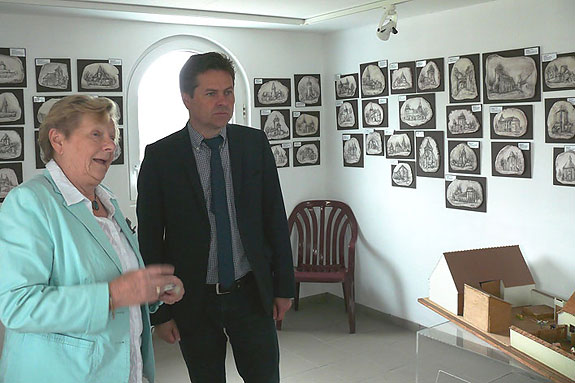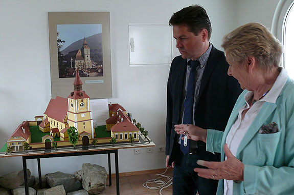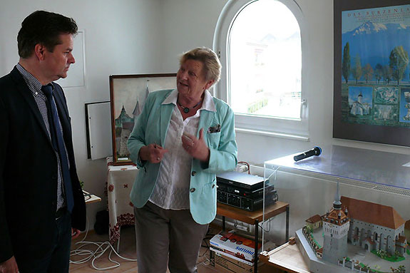 Im Anschluss bestieg Bürgermeister Ulrich Stücker mit Enni Janesch und der Adele Zay Vorsitzenden Ulrike Horwarth gemeinsam den Turm der Erinnerung und Enni Janesch erläuterte auf den einzelnen Etagen Auszüge zur Geschichte der Siebenbürger-Sachsen.
